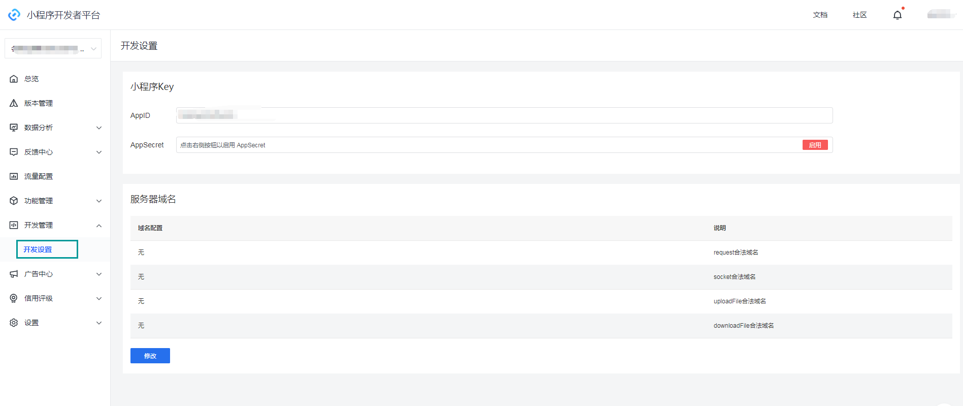 2.设置字节跳动小程序基本信息,字节跳动小程序平台【开发管理】——【开发设置】下获取APPID和APPSECRET