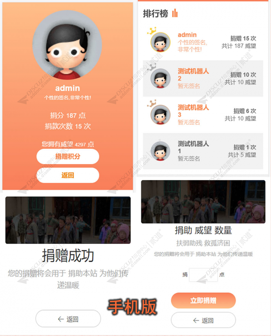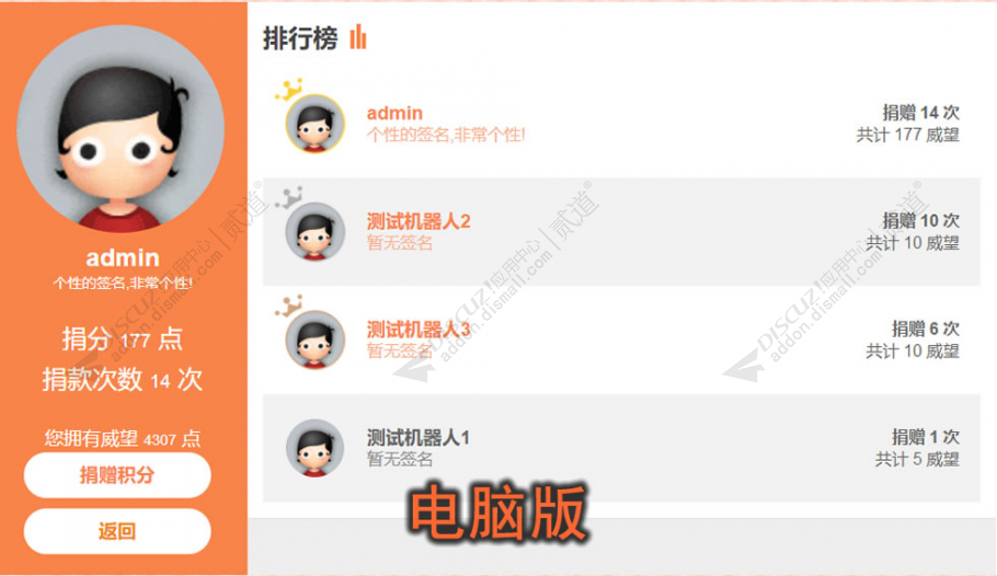 4.会员捐助的积分会凭空消失 , 捐助的会员会按照捐献积分多少形成排行榜;